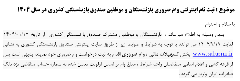 ثبت نام اینترنتی وام ضروری بازنشستگان و موظفین صندوق بازنشستگی کشوری ۲۰ فروردین ۱۴۰۴ | ۱۱:۵۹ کد : ۵۰۶۴۱ اطلاعیه ارسال به دیگران نام شما ایمیل شما ایمیل دریافتکننده ارسال انصراف تعداد بازدید:۴۴۲۵ ثبت نام اینترنتی وام ضروری بازنشستگان و موظفین صندوق بازنشستگی کشوری