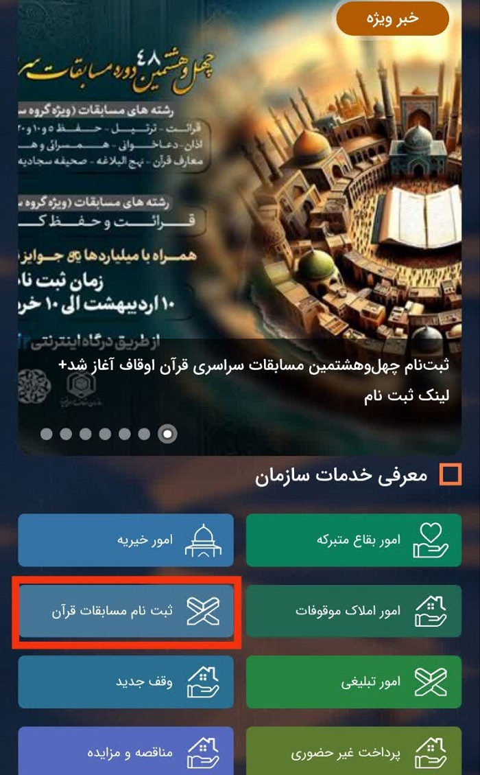 به اطلاع می رساند ثبت نام چهل و هشتمین دوره مسابقات سراسری قرآن کریم در رشته های قرائت ، ترتیل ، حفظ ۱۰،۲۰ ،۵ و کل قرآن کریم ، اذان ، دعاخوانی ، همسرایی و همخوانی قرآن کریم ، معارف قرآن ، نهج البلاغه ، صحیفه سجادیه و ترجمه عمومی قرآن ، ویژه گروه سنی بالای ۱۸ سال و رشته های قرائت و حفظ کل قرآن کریم ، ویژه گروه سنی ۱۲ تا ۱۸ سال از تاریخ  ۱۴۰۴٫۰۲٫۱۰ تا ۱۴۰۴٫۰۳٫۱۰ از طریق درگاه OGHAF.IR آغاز شده است.