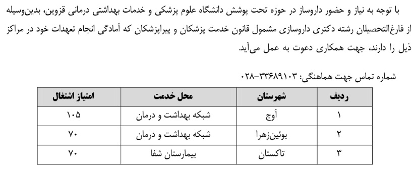 جذب نیروی داروساز مشمول قانون خدمت ۲۵ آذر ۱۴۰۴ | ۰۹:۰۰ کد : ۵۷۰۵۷ اطلاعیه ارسال به دیگران نام شما ایمیل شما ایمیل دریافتکننده ارسال انصراف تعداد بازدید:۵۲۲ جذب نیروی داروساز مشمول قانون خدمت در دانشگاه علوم پزشکی قزوین