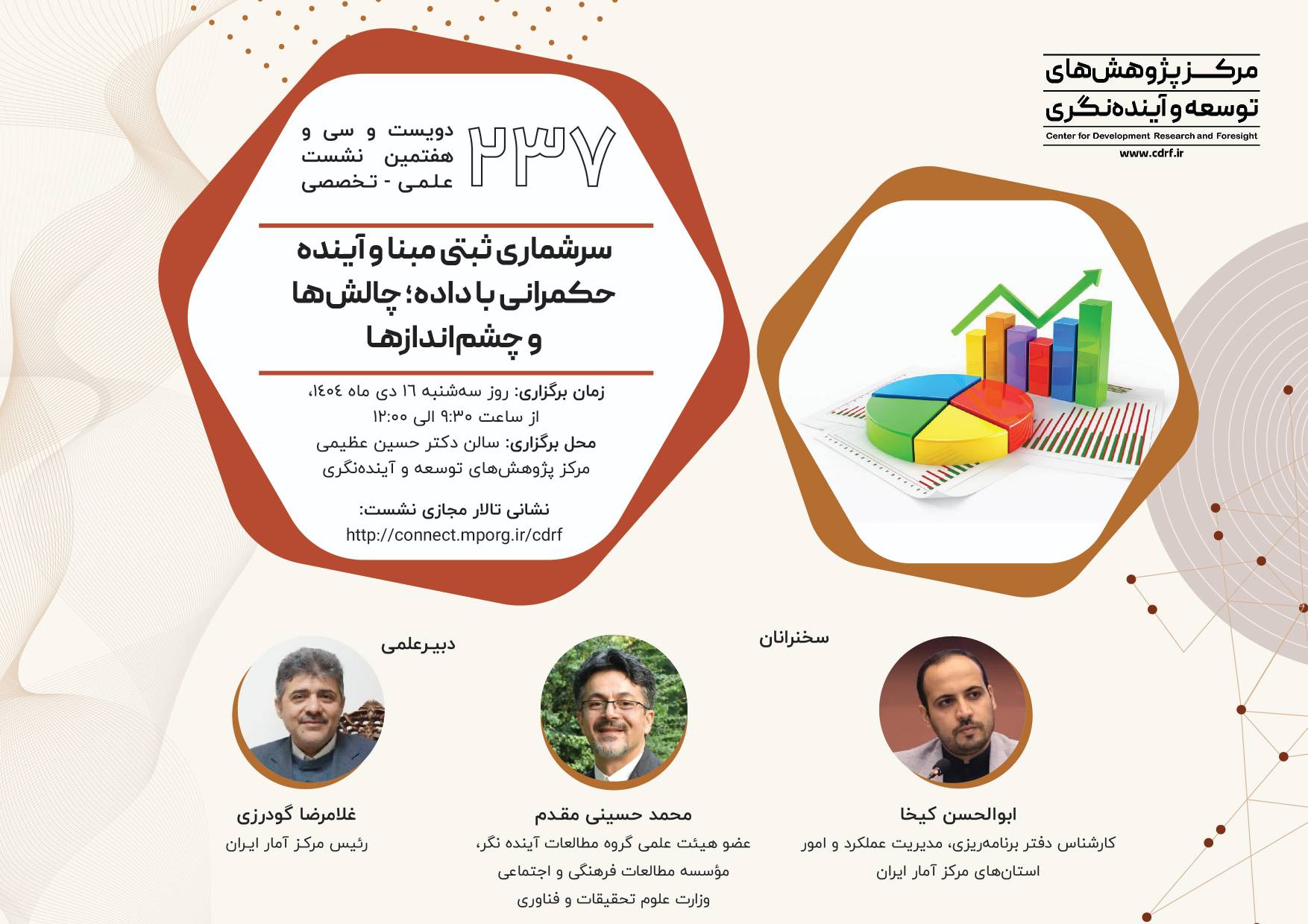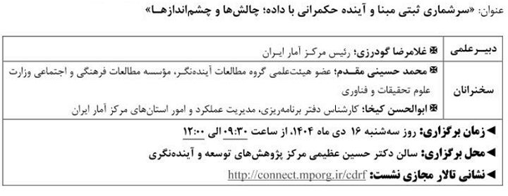 نشست علمی سرشماری ثبتی مبنا آینده حکمرانی با داده ۱۴ دی ۱۴۰۴ | ۱۰:۲۱ کد : ۵۷۴۱۸ اطلاعیه ارسال به دیگران نام شما ایمیل شما ایمیل دریافتکننده ارسال انصراف تعداد بازدید:۴۲۶ دویست وسی وهفتمین نشست علمی - تخصصی با عنوان سرشماری ثبتی مبنا آینده حکمرانی با داده، چالش ها وچشم اندازها